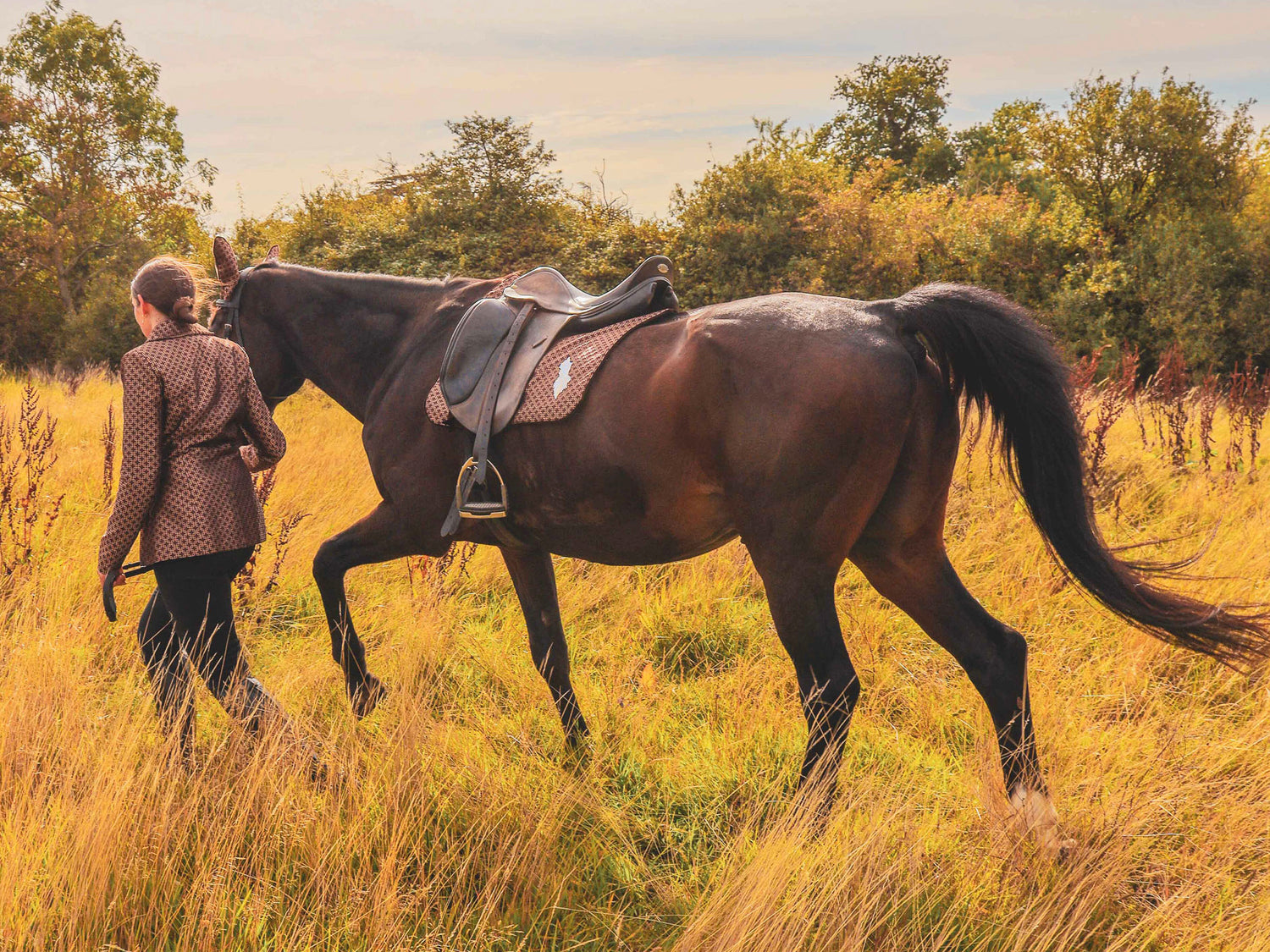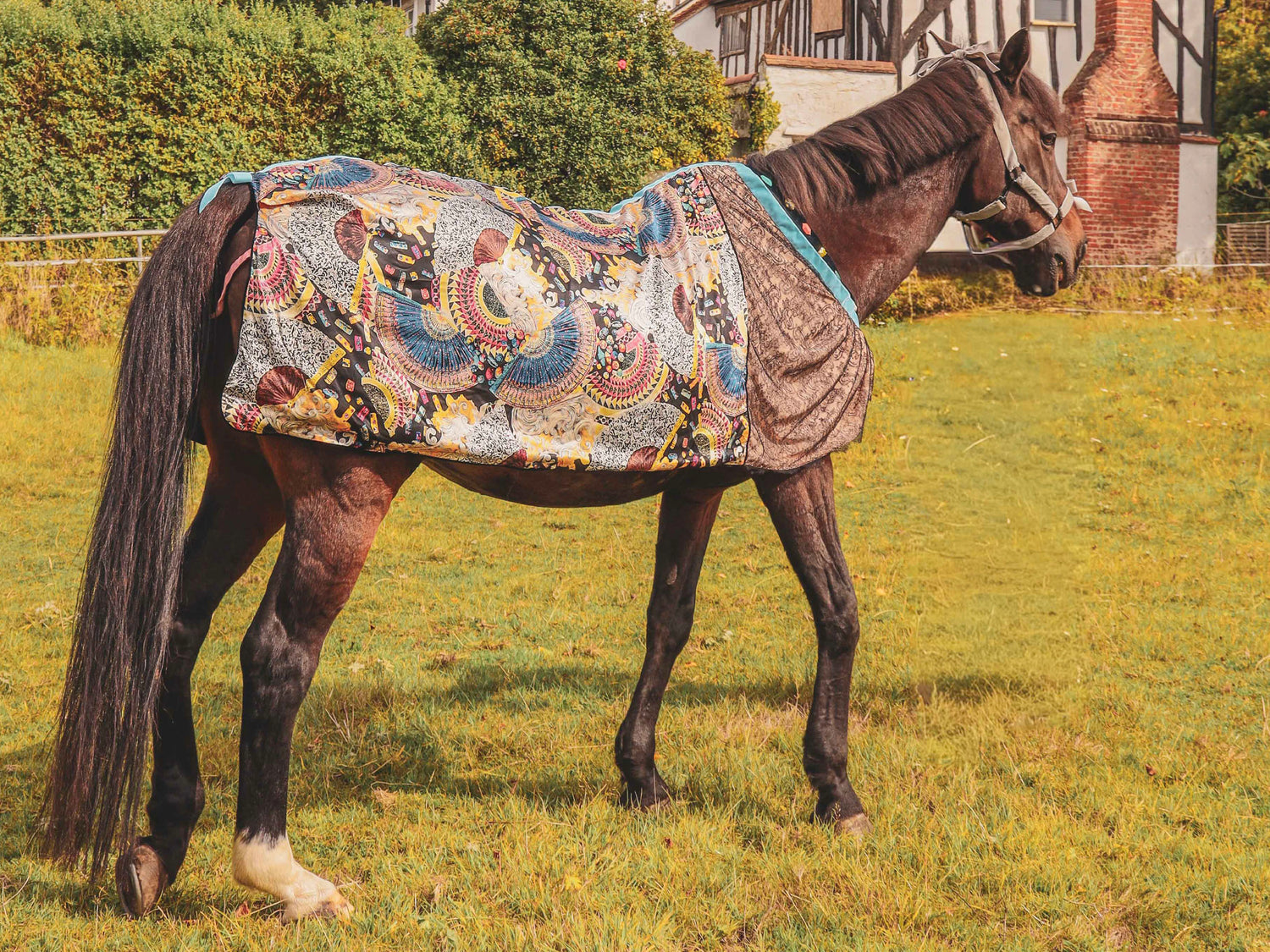 The rug does not merely cover; it accompanies. With each stride the fabric yields and returns, gliding over the contours of muscle and bone like liquid light, weightless yet warm, fluid yet precise, moving as the horse himself moves.