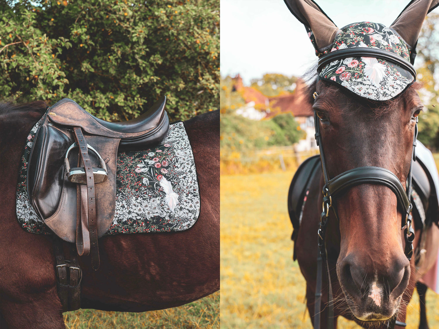 An expression of equestrian refinement. Exquisitely crafted saddle pads and fly bonnets, bespoke in design and finished with uncompromising attention to detail.